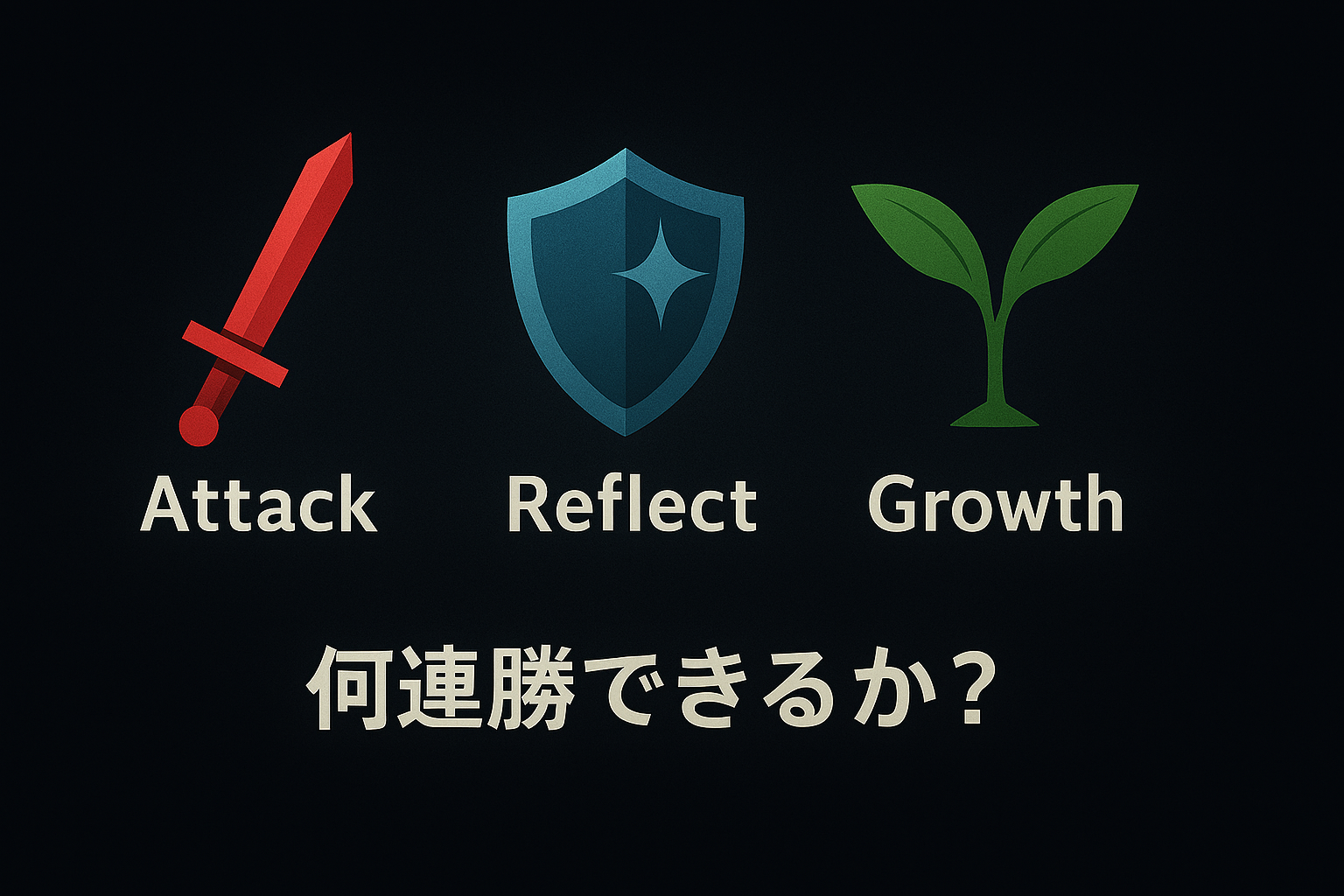 戦闘ゲームを作成しました。パラメータはPOWERのみで、0になったら負け。負けるまでに何連勝できるかというシンプルなものです。倒した敵の数が多いほど、戦闘にかかった時間が短いほど、高得点になります。https://practice.asabori.com/p006/ 【ルール】attack reflect growthの3つから行動を選択します。attackは敵に攻撃します。与えるダメージは自分のpowerに依存します。reflectは敵の攻撃を反射します。与えるダメージは敵のpowerに依存します。growthは自分のpowerを増加させます。増加するpowerの量は自分のpowerに依存します。前のターンで選択した行動は選択できません。敵を倒したらすぐに次の敵が現れます。敵は少しずつ強くなります。